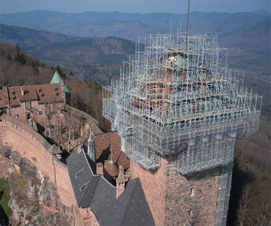 HAKI Stillads kan føre dig til nye højder! #gethooked på dets alsidighed, lette vægt og sikkerhed. Tjek lige dette fremragende job højt oppe på toppen af bjergene på det fantastiske Château du Haut-Kœnigsbourg i Orschwiller, 50 km syd for Strasbourg, Frankrig.